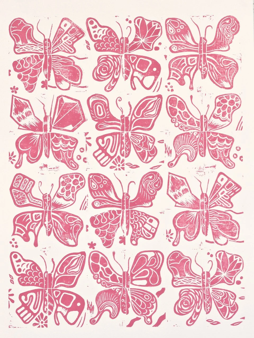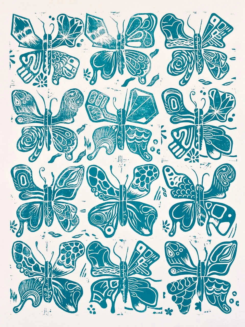 These brightly coloured works printed from 52 individually carved lino blocks celebrate these unique beings and the natural diversity that has always existed. Each wing quadrant can be mixed with others allowing for numerous wing combinations. The patchwork patterns that emerge are a reference quilting making, community care and solidarity with all unique beings.